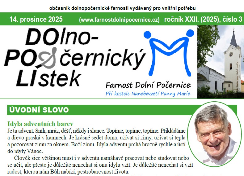 Příspěvky do DoPoLí zasílejte VÝHRADNĚ na adresu dopoli@farnostdolnipocernice.cz, nikoli na adresu farnosti, některých činovníků farnosti apod., jinak Vám nemůžeme zaručit, že budou patřičně zpracovány. Chcete-li k příspěvku připojit fotografii nebo obrázek, které nemáte v digitální podobě, můžete nám je předat buď v kostele nebo na faře.