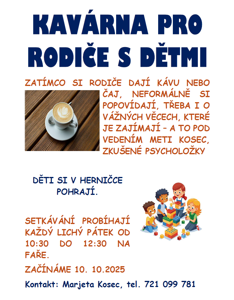 Zatímco si rodiče dají kávu nebo čaj, neformálně popovídají, třeba i o vážných věcech, které je zajímají – a to pod vedením Meti Kosec, zkušené psycholožky, děti si v herničce pohrají. Kavárna probíhá každý lichý pátek od 10:30 do 12:30 na faře, začíná se 10. 10. 2025.